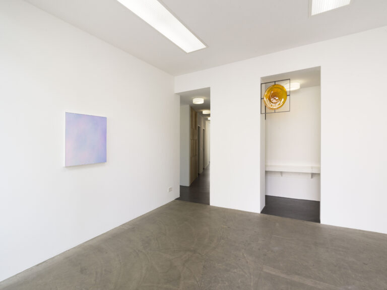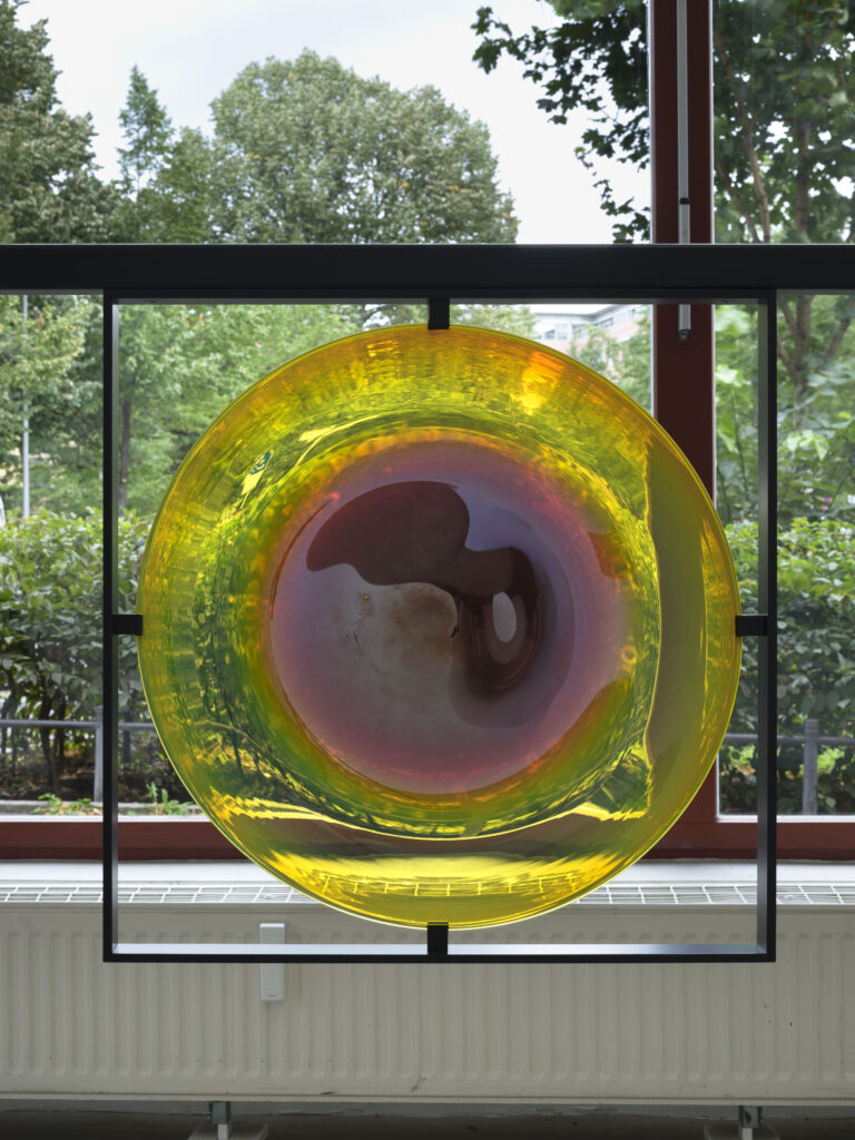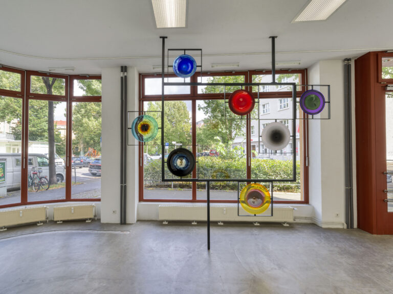 In his exhibition “Rion”, Braun presents new, traditionally hand-blown plate glass works in various colours, forming a transparent window installation accompanied by other three-dimensional glass works and new batik paintings. The glass discs capture fluid states, reflecting their surroundings and interacting with the light and weather. Similar to the batik works, they oscillate between everyday object, cultural reference, minimal art, image, and concrete object. Each one is different, one possibility among many: concentrated, handmade, yet devoid of an individual signature. They follow a migratory logic in which materials, perceptions, and meanings are in perpetual flux.