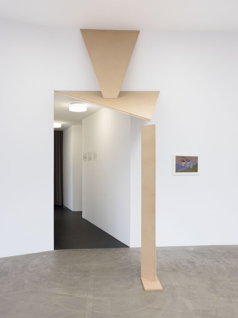 Drawing is a foundational activity for Andrew and he begins his days at the studio with it. Choosing a single word, he repeatedly outlines its letterforms, pulling at their legibility, submerging their meaning in compositional play. The abstraction of type becomes a conduit for pictorial ideas. Andrew’s interventions in BQ – the vocabulary of images, cut-outs and sculptures – are the direct result of this routine, transferred from page to architecture. A sketch-book of speculative set designs also aided the installation. In this way, two largely hidden aspects of his studio practice – letterform drawings and stage set design – are central to the exhibition in Berlin.