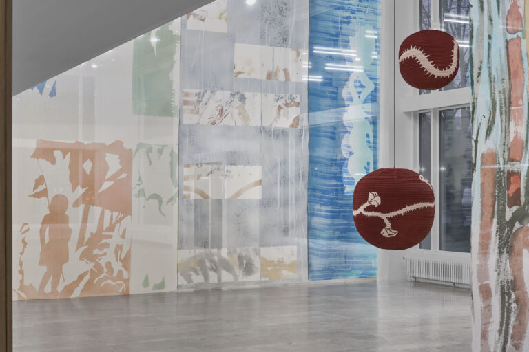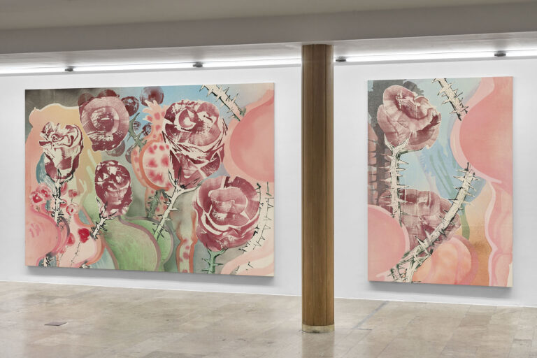 Lutz-Kinoy’s is a practice grounded in performance, marked by a fluid sense of movement and collective collaboration. In projects such as Filling Station at The Kitchen (2023), he re-staged a 1938 ballet as a live event that blended dance, music, and painting in real time. Similarly, his expansive ceramic productions, executed with skilled artists and artisans, transform making into a communal performance, where process and interaction are integral. For his exhibition at the gallery, he also welcomes the participation of his contemporaries, with written and performed contributions by the artists Isabel Lewis, Niall Jones and PRICE. A model of radical interdisciplinarity in the early 20th century, the Ballets Russes is a point of reference in the exhibition. Lutz-Kinoy re-imagines forms and symbols of a lineage where performance and visual spectacle merged. The works on view navigate towards the iconic and dramatic narratives of the historic company; flowers painted in human scale imagine Vaslav Nijinsky as an anthropomorphic thorned rose. And, as if lifted from the canvas, suspended paper lanterns painted with graphic floral iconography punctuate the gallery. Two painted canvases, each informed by the performance practices of Isabel Lewis and Niall Jones, reach floor to ceiling, segmenting the space into a metered rhythmic dramaturgy. These monumental paintings emphasize Lutz-Kinoy’s treatment of floors, walls and ceilings as active surfaces, creating a spatial dialogue that turns the show into an ephemeral setting. Bolero Bordello reflects Lutz-Kinoy’s interest in mirroring song structure within exhibition design. Taking inspiration from Maurice Ravel’s Boléro, originally choreographed by Bronislava Nijinska, the composition engages with the legacy of the Ballets Russes and the aftermath of Sergei Diaghilev’s creative and bordellic universe. Through its cyclical rhythm, sensual repetition, and collaborative ethos, Boléro reimagines the decadent theatricality and cross-disciplinary experimentation that defined Diaghilev’s epoch. In Lutz-Kinoy’s hands, this legacy becomes a spatial choreography.