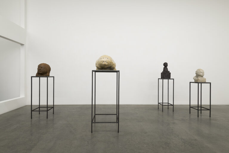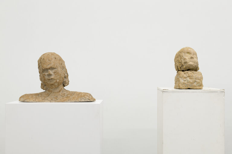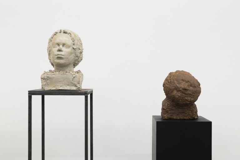 Distributed throughout the gallery, a suite of fired clay busts displayed on metal stands and wooden plinths seek company, inviting us to mingle among them – become one of the bunch. In this communion of earthy-toned oddfellows, each work has its own eye-catching bent and eccentric surface. The figures appear as if in a liminal state. Characters and emotions, imagined conversations and phantom memories fill the room – all of them invented.