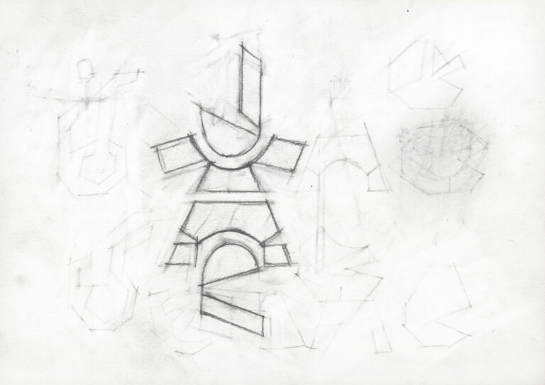 Drawing is a foundational activity for Andrew and he begins his days at the studio with it. Choosing a single word, he repeatedly outlines its letterforms, pulling at their legibility, submerging their meaning in compositional play. The abstraction of type becomes a conduit for pictorial ideas. Andrew’s interventions in BQ – the vocabulary of images, cut-outs and sculptures – are the direct result of this routine, transferred from page to architecture. A sketch-book of speculative set designs also aided the installation. In this way, two largely hidden aspects of his studio practice – letterform drawings and stage set design – are central to the exhibition in Berlin.