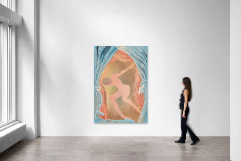 Lutz-Kinoy treats exhibitions like immersive architectures, positioning painting as backdrop and sculpture as spatial intervention. Often conceived as total environments, his works respond to a venue’s architecture and site-specificity, entwining sensual, silhouetted bodies with recurring ornamental motifs, vegetation and floral arabesques, references to art historical movements, from Expressionism and Art Nouveau to Rococo flourishes. His paintings also carry the carnal vitality of 18th-century traditions, with dynamic bodily forms, gestural brushwork and ethereal layers, coupled with an ability to traverse a transhistorical landscape. These sensuous environments can feel like entry points to alternative spaces of communion, where the synergy of historical ornament and abundance lingers in compositions that suspend urgency, acting as parts of an escapist practice. Pleasure, color, intimacy and motion are foregrounded, as Lutz-Kinoy cultivates spaces where existential and emotional possibilities can unfold, allowing alternative forms of freedom to surface. Working across painting, ceramics and performance, the artist develops a plural and cross-referential practice that draws on diverse historical lineages.