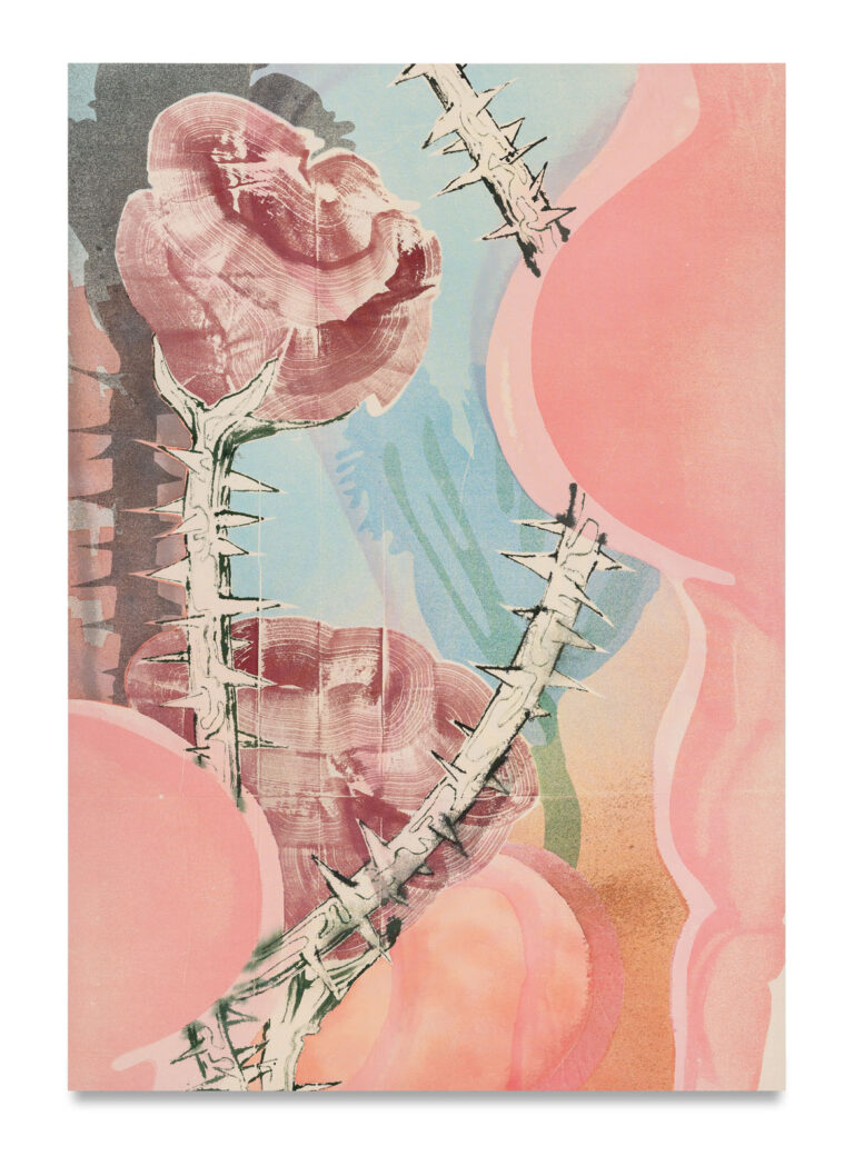 Lutz-Kinoy’s is a practice grounded in performance, marked by a fluid sense of movement and collective collaboration. In projects such as Filling Station at The Kitchen (2023), he re-staged a 1938 ballet as a live event that blended dance, music, and painting in real time. Similarly, his expansive ceramic productions, executed with skilled artists and artisans, transform making into a communal performance, where process and interaction are integral. For his exhibition at the gallery, he also welcomes the participation of his contemporaries, with written and performed contributions by the artists Isabel Lewis, Niall Jones and PRICE. A model of radical interdisciplinarity in the early 20th century, the Ballets Russes is a point of reference in the exhibition. Lutz-Kinoy re-imagines forms and symbols of a lineage where performance and visual spectacle merged. The works on view navigate towards the iconic and dramatic narratives of the historic company; flowers painted in human scale imagine Vaslav Nijinsky as an anthropomorphic thorned rose. And, as if lifted from the canvas, suspended paper lanterns painted with graphic floral iconography punctuate the gallery. Two painted canvases, each informed by the performance practices of Isabel Lewis and Niall Jones, reach floor to ceiling, segmenting the space into a metered rhythmic dramaturgy. These monumental paintings emphasize Lutz-Kinoy’s treatment of floors, walls and ceilings as active surfaces, creating a spatial dialogue that turns the show into an ephemeral setting. Bolero Bordello reflects Lutz-Kinoy’s interest in mirroring song structure within exhibition design. Taking inspiration from Maurice Ravel’s Boléro, originally choreographed by Bronislava Nijinska, the composition engages with the legacy of the Ballets Russes and the aftermath of Sergei Diaghilev’s creative and bordellic universe. Through its cyclical rhythm, sensual repetition, and collaborative ethos, Boléro reimagines the decadent theatricality and cross-disciplinary experimentation that defined Diaghilev’s epoch. In Lutz-Kinoy’s hands, this legacy becomes a spatial choreography.