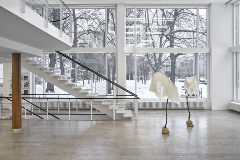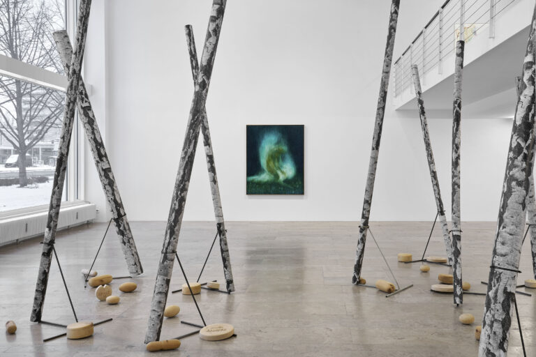 In Beckett’s Not I, the voice is severed from the body, speaking without pause or control, an articulation driven less by intention than by compulsion. This sense of being overtaken, of speaking before understanding, finds resonance in the works in the exhibition, where forms and narratives seem to emerge from places, where the past insists. It transforms what in Beckett appears as crisis into an act of recognition, opening room for the past to return in unruly shapes. Martin Kippenberger’s (b. 1953; d. 1997) installation Jetzt geh ich in den Birkenwald, denn meine Pillen wirken bald (Now I‘m going to the birch forest, because my pills will soon take effect), with its distorted birch trunks and scattered pills, stages a forest as a site of psychological disorientation, where perception buckles.
