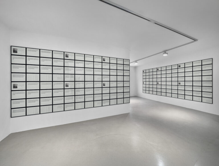 Memory always insists, even if the self refuses to claim it. The result is a voice caught between confession and flight, compelled to articulate what it cannot acknowledge as its own – not I. This dynamic finds a powerful counterpoint in Hanne Darboven’s (b. 1941; d. 2009) Hommage an meinen Vater (Homage to my father), which approaches memory through accumulation, repetition and duration. Hand-inscribed sheets transform personal loss into a monumental system of notation, where grief is methodically repeated until it becomes a defined, visible structure.