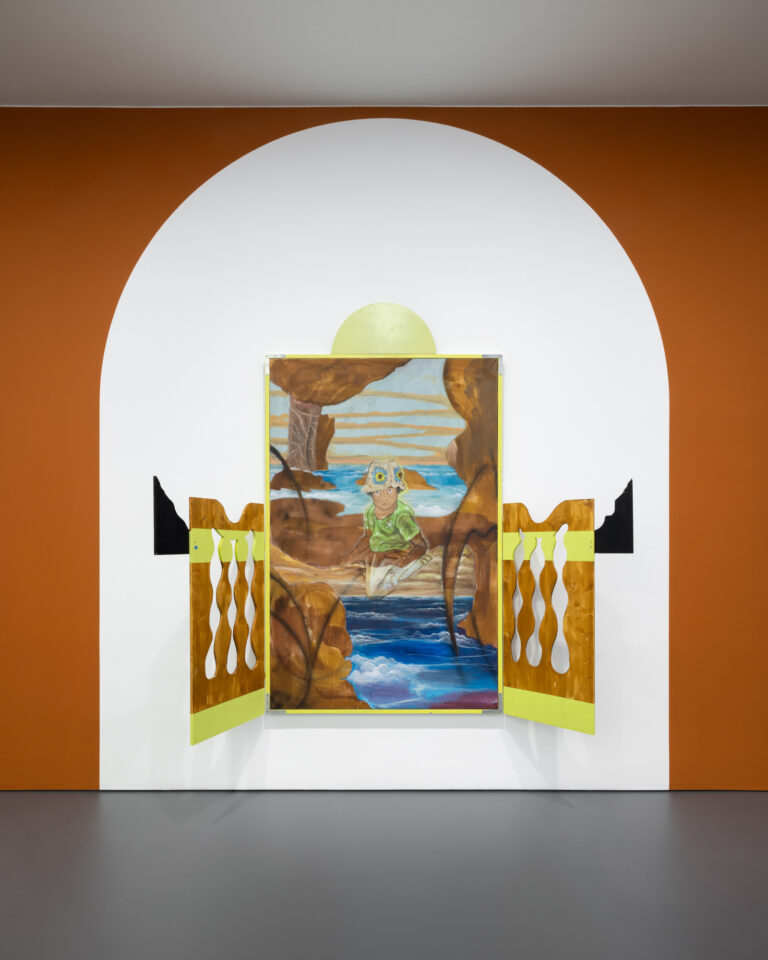 The exhibition space is conceived as a quiet courtyard. Two wooden arches flank the entrances to the exhibition, marking points of passage. A sequence of four trompe l’œil frescoes depicting a seascape creates this setting, and mirrored surfaces affixed to two central pillars reflect and multiply the viewer’s presence. Here, the courtyard functions not only as an architectural reference, but also as a social space—a place for encounters, circulation, and contemplation. In this way, it echoes Édouard Glissant’s notion of the “creole garden,” where identity grows through relation, crossings, and exchanges rather than fixed origins. Radin’s courtyard becomes a spatial expression of this idea: an environment where echoes reverberate and histories converge.