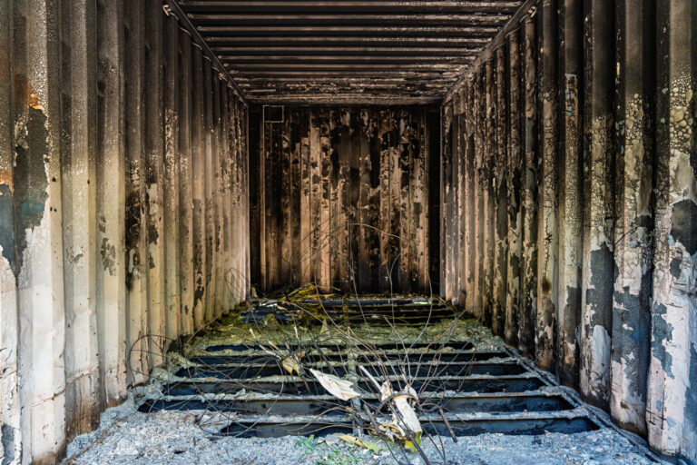 View inside one of the charred and graffitied steel shipping containers housing ‘Syrigana’ props, Syrigana, 2025