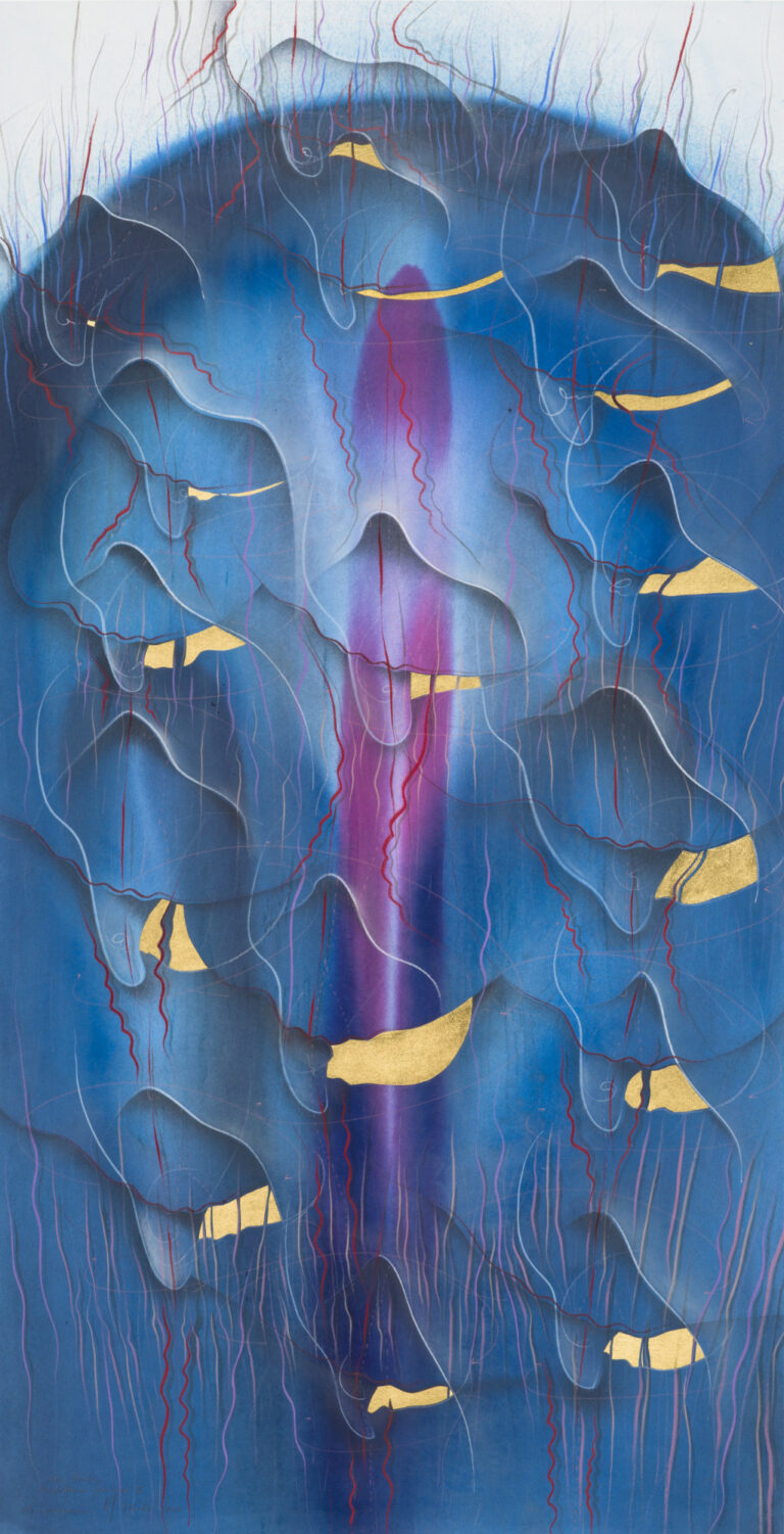Gold leaf, ink and pastel on paper, framed