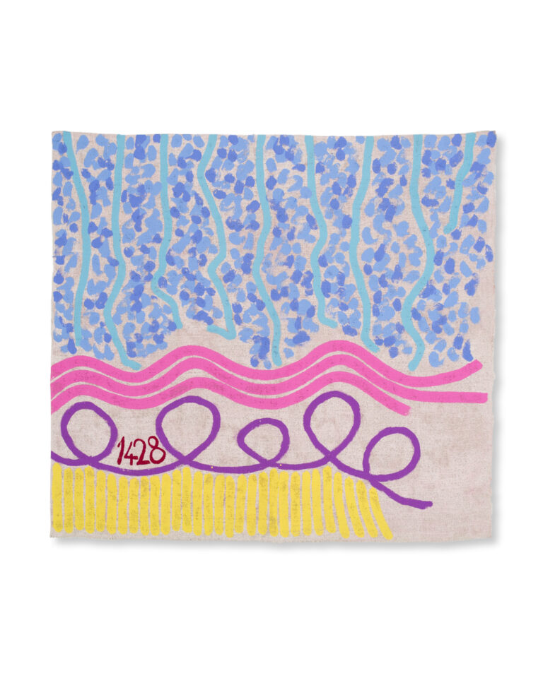Also, in the Hof Walter Storms gallery – founded in Munich and now also based in Berlin – presents the internationally acclaimed Giorgio Griffa, who was the subject of a major retrospective at Centre Pompidou in 2022. Griffa paints directly onto raw, unprimed canvas – often working on the floor – tracing sequences of numbers, dots and fragments of text across its grainy surface. The resulting compositions, at once restrained and lyrical, are pinned loosely to the wall, recalling the aching lightness of Italian fresco.