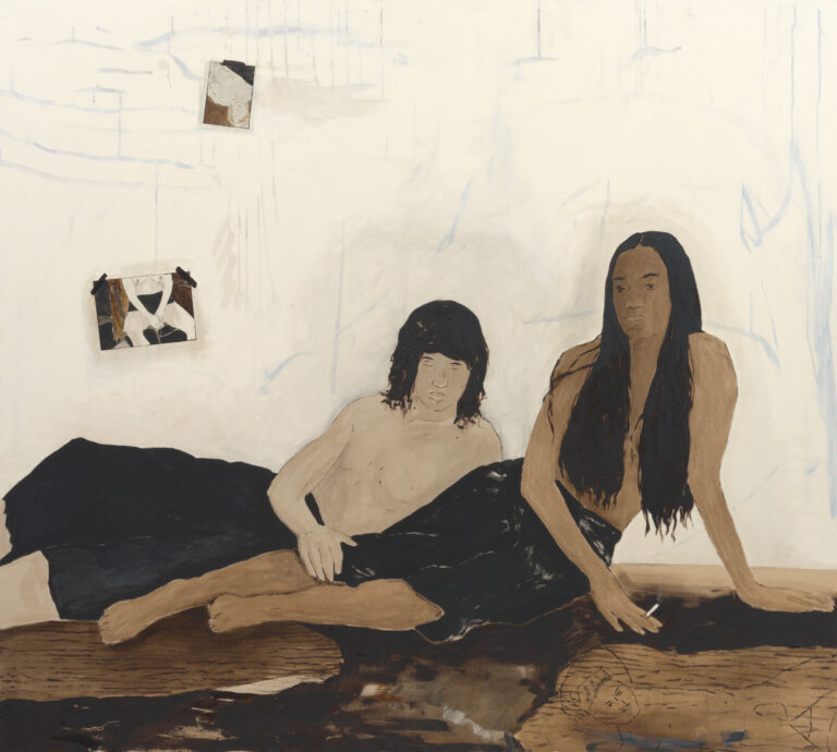 At Eigen & Art on Auguststraße, Brett Charles Seiler stages tender encounters between his “occasional lovers.” Seiler has lived in Cape Town since completing his art studies, but was born in Zimbabwe, a country where same-sex acts remain criminalized. His paintings focus on male bodies — their desires and insecurities — shown alone, half-dressed and self-possessed, or caught in moments of quiet intimacy. The work has a poetic, nostalgic quality, loose and spontaneous in its handling, with small found objects, flea market discoveries among them, tucked into the surface. Text fragments appear throughout, recalling the kind of scrawl found on the walls of public restrooms.
