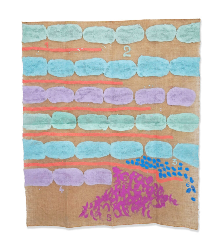 Characteristic of his entire body of work is the way Griffa draws lines, places dots, and writes numbers and texts on unprimed fabric, linen, or cotton, fixing the canvases directly to the wall with fine needles, without stretcher frames.