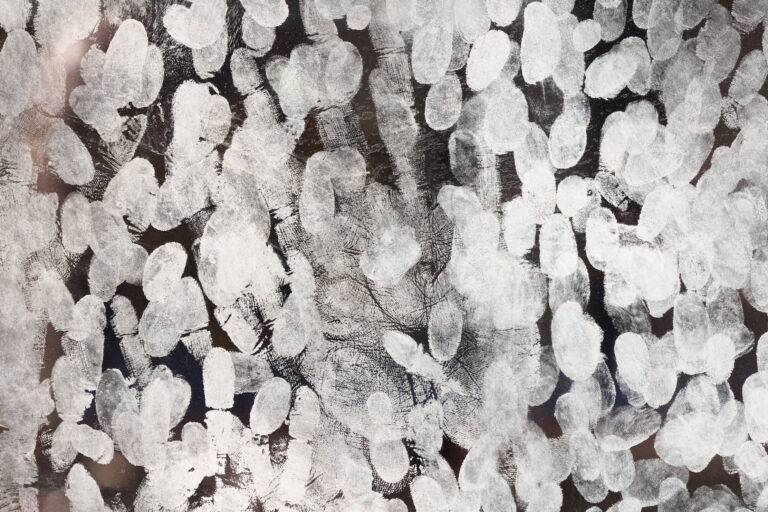 Fingerprints placed close to the gallery windows reveal, in a forensic manner, our almost imperceptible yet most frequently left behind traces. They are situated at the boundary between two types of public space: the outside world and the exhibition space.