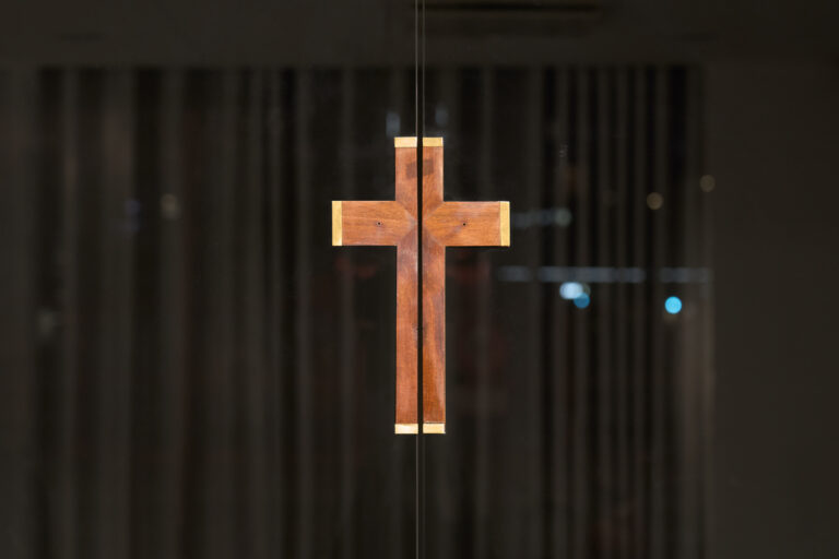Upon entering the gallery, visitors are confronted with a modified sliding door. A wooden crucifix is affixed to the center of the two glass panels, which is split in two when the door is opened. Other crucifixes in the exhibition, cast in epoxy resin, also employ this symbol in unusual ways.