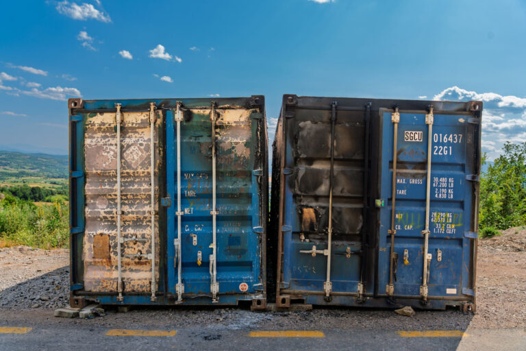 Charred and Graffitied steel shipping containers housing ‘Syrigana’ props, Syrigana, 2025