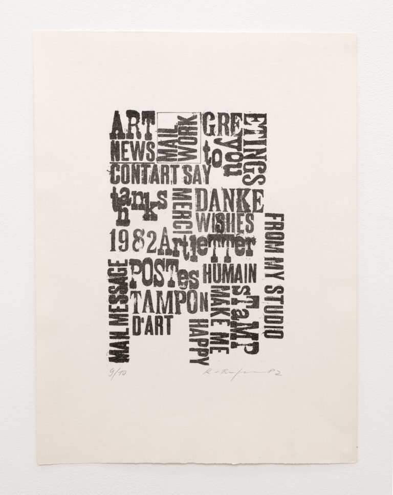 Rehfeldt entered the mail art network in the early 1970s. This community of artists exchanged works—often postcards, photocopies, rubber-stamp impressions, and small objects—through the postal system. By the middle of the decade, he collaborated at a distance with Horacio Zabala, whose exchanges with Robert Rehfeldt provide further insight into the development and context of his practice within the exhibition. Born in 1943 in Argentina, Zabala initially trained as an architect. While still living in Buenos Aires, he developed a conceptualist practice that grappled with the possible role of art amidst extreme political repression. After a military coup in 1976, he left the country and remained in Europe for over 20 years. His mail art will also be on view.