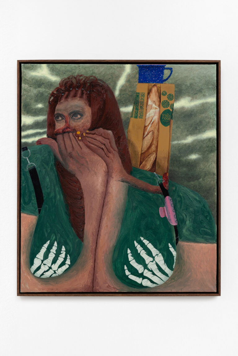 The eccentric figures that populate Celeste Rapone’s paintings allegorize the generational unease, anxiety, and ennui peculiar to millennials. In a recurring compositional gesture, bodies are positioned in contorted and crammed poses. Their limbs press against the edges of the canvas, poised to burst the picture plane. As they rub against the frame, these figures appear to thrive and ache at once. Much like her intriguing autobiographical avatars, the domestic interiors Rapone depicts are subject to surreal montages while spiked with nods to art history.