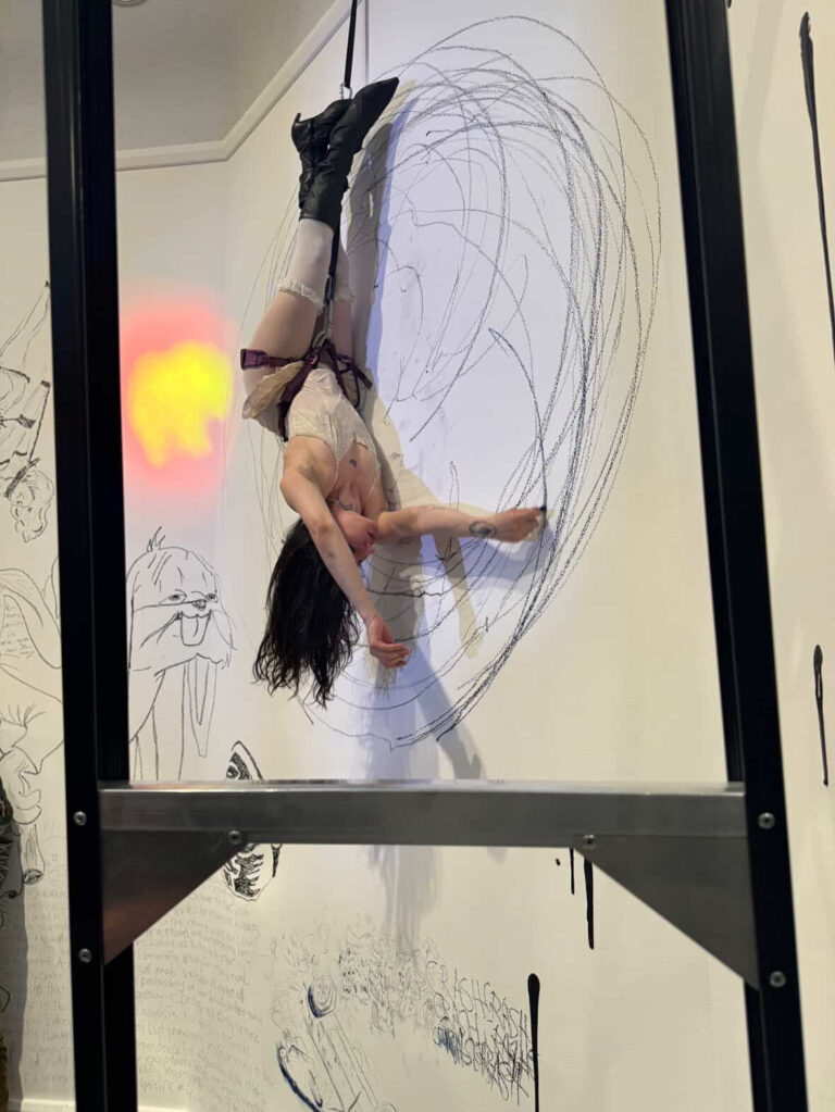 Using the immateriality and ephemerality of performance as its primary engine, the exhibition explores how immaterial forces—gesture, sound, tension, exhaustion, and collective movement—condense into matter. Bodybuilders, karate and grappling practitioners, a pole dancer, suspended performer, and growler activate the space through prolonged physical actions, accompanied by fragments of text that reverberate through the space. These bodies function as kinetic instruments that generate the exhibition”s paintings and drawings: pigment transferred through contact, movement traced through repetition, surfaces marked by strain and gravity.