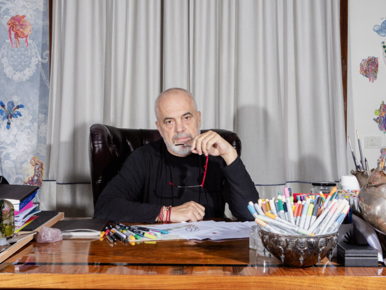 Edi Rama creates exuberant compositions that embody a symbiosis between art making and politics. At the core of the Albanian Prime Minister’s artistic practice are his vivid stream-of-consciousness drawings, produced during meetings in his office, where free, expressive lines unfold alongside the structural demands of political life. These mindscapes act as a springboard for experimentation: biomorphic blots and amorphous shapes evolve into compositions that resist fixed reference or narrative.