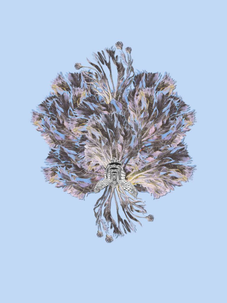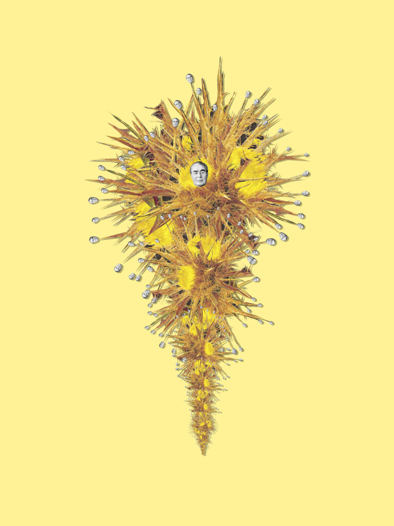 These identities, both doubled and concealed, are devoid of further context or indication. The colorless photographs, ostensibly belonging to the past yet enduring, contrast with the vibrancy and fragility of the flowers – fully alive, fully present. The photomontaged figures hover before the wall, casting varied shadows that create a gap, opening a space. Further shadows are inserted into the image, between head and flower, flower and body, adding an imaginary dimension that contributes to a heightened realism, while emphasizing a constructed nature. In juxtaposition with the flowers that disguise and subsume them, the politicians’ bodies become a kind of shadow themselves.