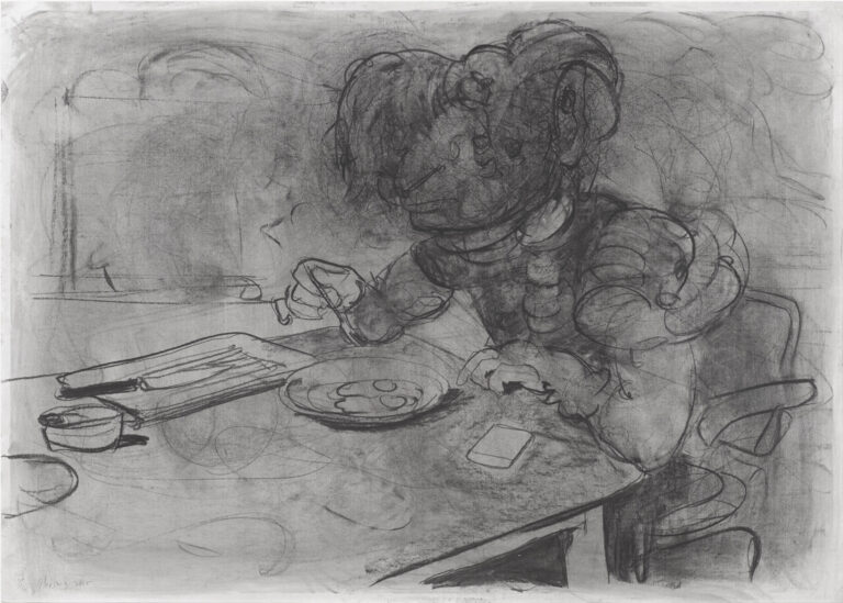 Looking at the paintings and drawings themselves, and at the humanoid creatures that inhabit them, their deformed limbs and heads with indefinable physiognomies bring to mind the creature from Kafka’s novella The Metamorphosis, and characters from a wide range of science fiction films. Ghenie’s topical starting point, the brain rot, describes an inner condition, and as such cannot be represented by figurative means. Nor is that the artist’s goal. It is not without reason that he used the title “Impossible Body” for some of these creatures in earlier paintings. He is interested in brain rot as a new “texture” that may manifest itself in the overall composition, but not in the figure. The figure’s task is to illustrate the artist’s everyday life, which consists of a series of recurring routines. It may come as a surprise that an internationally successful artist would describe his everyday life in this way. But he insists that being an artist is like being a butcher or an office clerk. And he rightly points out that for most people, the routine nature of their lives has become even more pronounced through their use of social media. Reaching for the phone as the first thing after waking up and quickly swiping through the first 30 posts that the algorithm has compiled for us is, of course, exactly that: a new but already deeply ingrained routine. In the painting Untitled, Ghenie has depicted himself and his assistant at lunch in a fast food restaurant. In the background we recognize a Roman frieze like the ones you would find on a wall in Pompeii. Even in Rome, where Ghenie maintains a studio, fast food restaurants aren’t decorated in such a sophisticated manner. So, the “impossible bodies” are joined by an impossible decor. In the same spirit, Ghenie painted what is perhaps the most surprising picture in the exhibition, Figure with Chicken. It does indeed show the eponymous chicken-eating figure, but the composition is majestically ruled by a strikingly patterned tablecloth. Its floral print, reminiscent of Matisse, is more likely to be associated with a visit to grandma’s than a visit to a fast food restaurant. In Dune we see a figure watching the film based on Frank Herbert’s books. Like messaging on our smartphones, streaming movies has become a matter of course that, in theory is providing us access to the riches of film history, but in reality, has cemented yet another routine. The figure in the painting Nexus has put its phone aside and is reading the bestseller written by Yuval Noah Harari on the history of information networks. Its last chapter deals with the risks and dangers that lie in Artificial Intelligence. The presence of an analog book, written by a human being, offers some comfort in this digitalized world. As do, in a strange way, the fried eggs in the above mentioned The Breakfast, and the loaf of bread. In The Nightbird 2, we encounter two behavioral traits of the “Homo digitalis.” On the one hand, there is this nocturnal activity. The figure is probably way past its bedtime – but cannot tear itself away from the screen. The times of day have lost their structuring function. On the other hand, as in The Breakfast, we see the challenging simultaneity of eating or drinking and operating an electronical device. It is as if the uninterrupted physical connection to a keyboard has become a vital element of the human metabolism. The same is true for the figure in Teenager 2. Drinking with the help of a straw at least offers the advantage of an unobstructed view onto the screen.