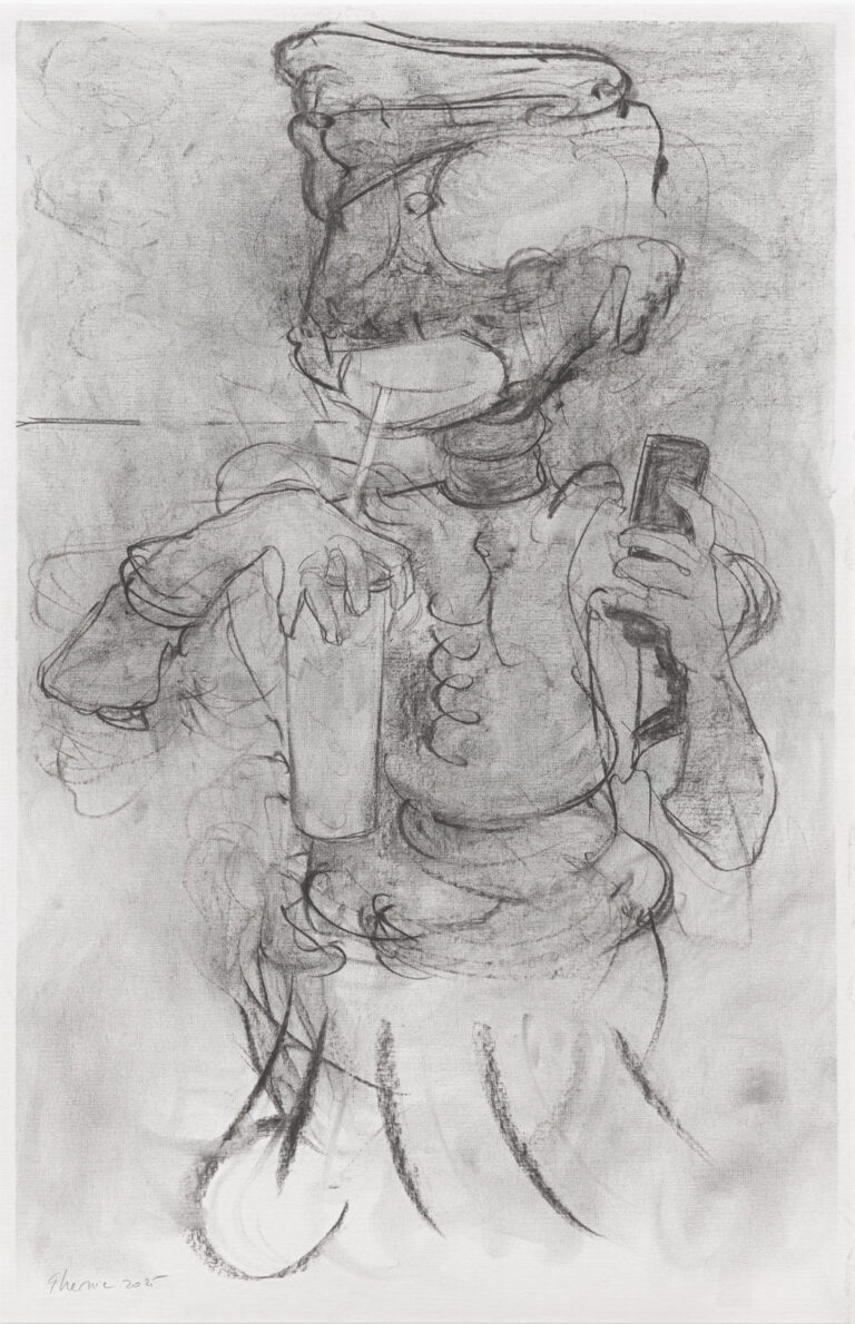 Last year, the term “brain rot” was named Oxford Word of the Year – and it is this buzzword that Ghenie draws on when asked about the trigger for creating the 8 paintings and 6 drawings (all in 2025) for Cloud Fever, the gallery’s sixth solo exhibition with the artist. The term refers to the impairment of cognitive abilities and the decrease of attention span caused by the endless consummation of low-effort, repetitive and – increasingly – fake digital content. In addition to sabotaging our ability to process complex thoughts, excessive use of social media can lead to a disconnection from reality and a decline in human exchange. Algorithms and artificial intelligence amplify emotional states and obsessions, and fake news tarnishes our sound judgment. Not to mention the deformation of the vertebrae of the neck, caused by the constant looking down. Nothing less than the upright walk, the hallmark of Homo sapiens, seems at stake. The digital conquest of our lives has the speed and impact of a pandemic, and we are all subjected to it. Some more than others.
