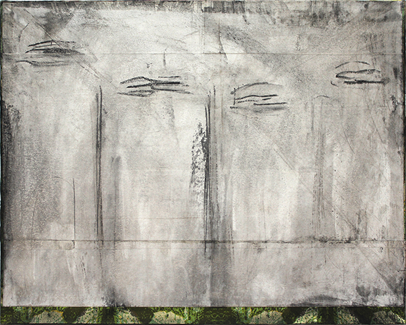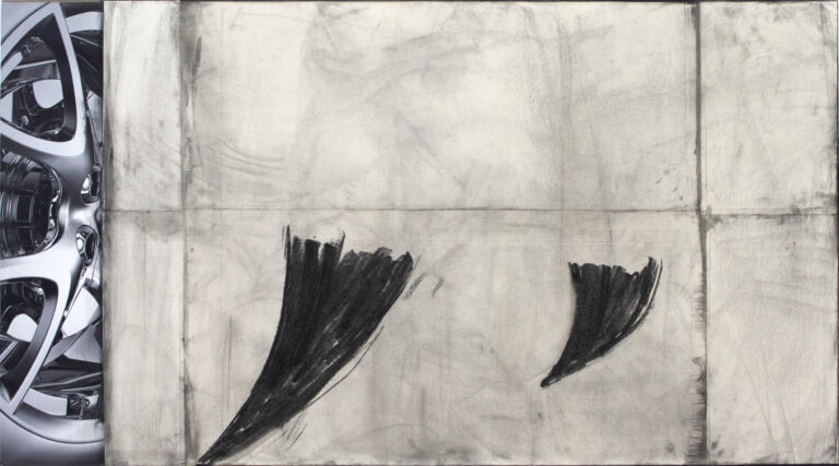 charcoal, oil-crayon, pigmets & wallpaper on canvas