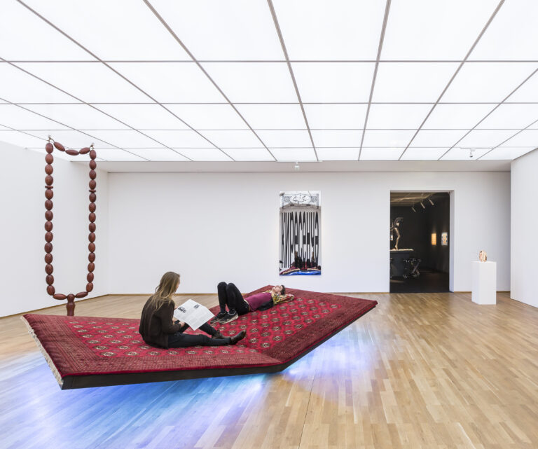 The eponymous exhibition takes the visitor to encounter one of Slavs and Tatars’ paradigmatic works, PrayWay (2012) in the first gallery space. The social sculpture offers a contemplation and materialization of books and reading. Since their beginnings as a book club in 2006, publications have been at the core of the collective’s activities. PrayWay refers formally to the rahlé, a traditional bookstand common to Central Asian Islam for holy books and the takht or topchan, what the collective calls RiverBed–in honor of its ideal placement by a source of water found at teahouses, roadside kiosks and at the entrances of mosques across Iran and Central Asia. PrayWay is a typical example of Slavs and Tatars’ participatory, relational works, creating a space for conversations, and intercultural communication.