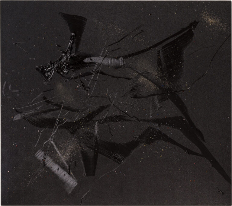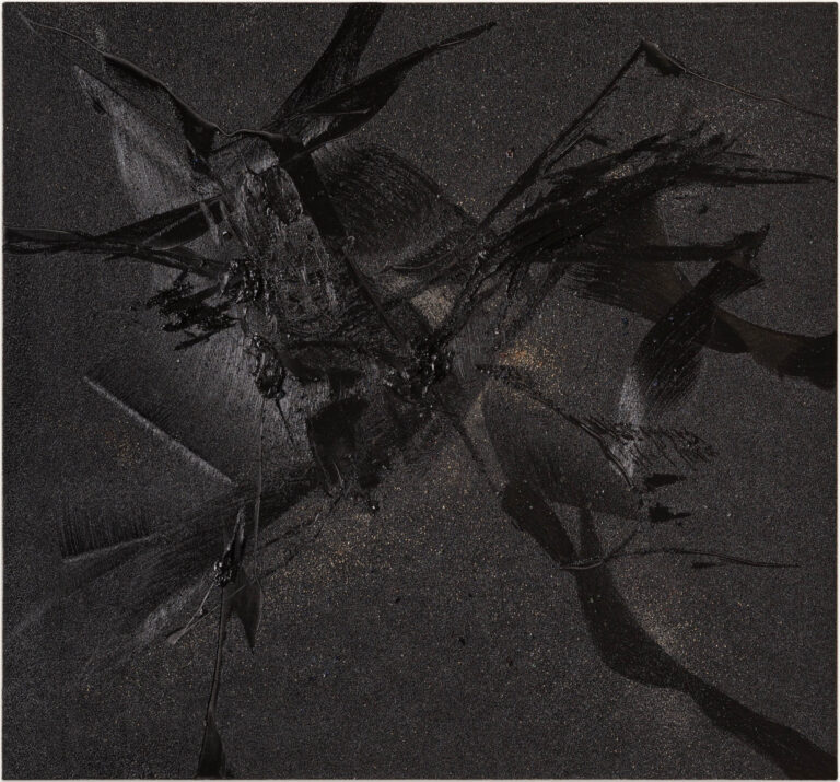 Thilo Heinzmann’s Keep On, his fourth solo exhibition with neugerriemschneider, features a selection of the artist’s sand paintings, the results of a new technique presented here following the release of his most recent monograph. With this latest development in his engagement with composition, texture and color, Heinzmann inverts the white of his pigment paintings, transforming it to black – a non-color that suspends sand and fragments of glass between subtractive gestures and upon black-on-black impasto applications – summoning a reflective, ever-shifting depth. For these works, he takes as precedent his past three decades of creation and of painterly investigation into his medium’s antagonisms and its fusions, its concepts and its process, its chaos and its precision, its traditions and its evolutions. With reductionism and restraint, Heinzmann imbues his works’ elements with dualities that at once build upon and question one another.