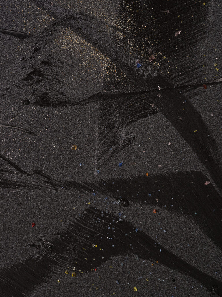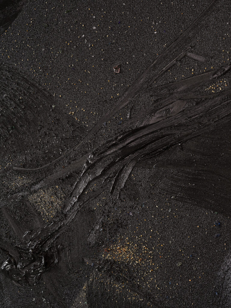 Chance and the physical meet among the pathways, channels and topography of Heinzmann’s sand paintings, as parts of a methodology in stark contrast to that of his pigment paintings – works that see wind assist fine, unbound particles of color onto canvas. Here grains of sand, in their infinite diversity, impart a stabilizing quality that translates the chromaticism of fleeting pigments into shimmering texture. Heinzmann’s assorted sands are punctuated by colored, hand-broken glass, the shards of which become reflective bodies connecting sand and thick black paint. The lines and contours, scored into the still-wet oil of his sand and pigment paintings with paint brushes, squeegees and fingers, stand as dynamic, guiding constants, having first taken root in his Tacmos (2010s) – an earlier group of all-black paintings. While these previous works wear protective acrylic-glass covers, his sand paintings do not. Instead, their monochromatic ground is left unhindered to conjure extraordinary depth and, in turn, to redirect the eye to the properties of light and the effects of its refraction. Heinzmann’s black concentrates the works’ elements, compacting them in a mode that runs counter to that of his pigment paintings. In an ongoing exchange with his own oeuvre, the viewer and the history of art, the artist paints distillations of his focused approaches, presenting a glimpse of those still to come.