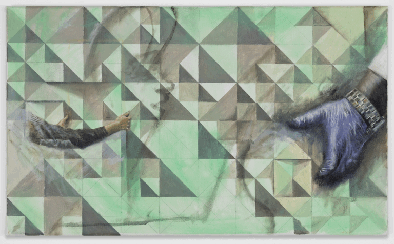 Next, the painting Untitled (handling) by Alison Yip shows two sets of hands handling objects that fade into the background. One can clearly see that the hands are holding something, yet what exactly this is remains concealed from the viewer. Through the differing perspectives on the hands, it becomes evi- dent that they must be situated in different contexts, brought together in a single moment within the canvas. Even though we are not seeing the full situation we add the remaining pieces, in this case the artworks to explain the situation we are seeing. This is only possible through the memories we collected and can clearly differ to another viewer.