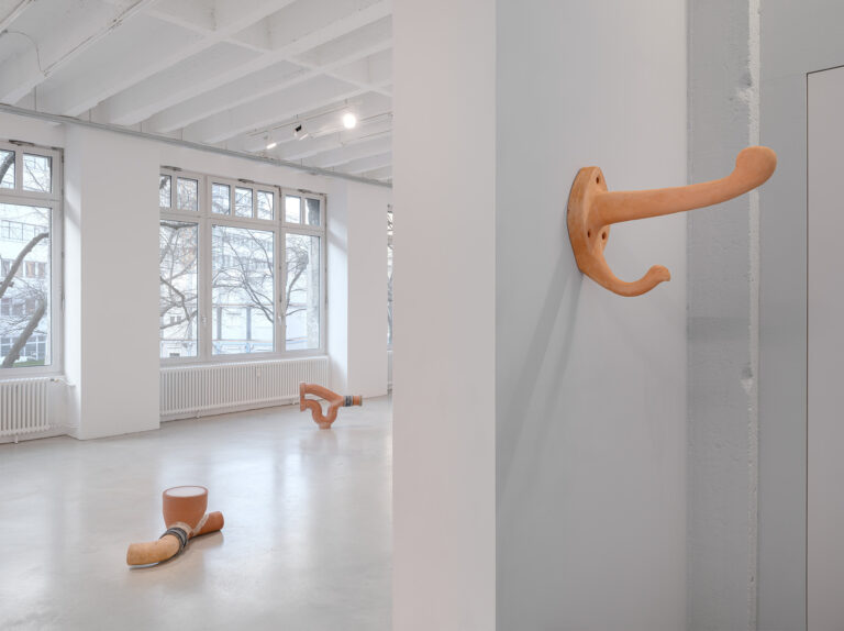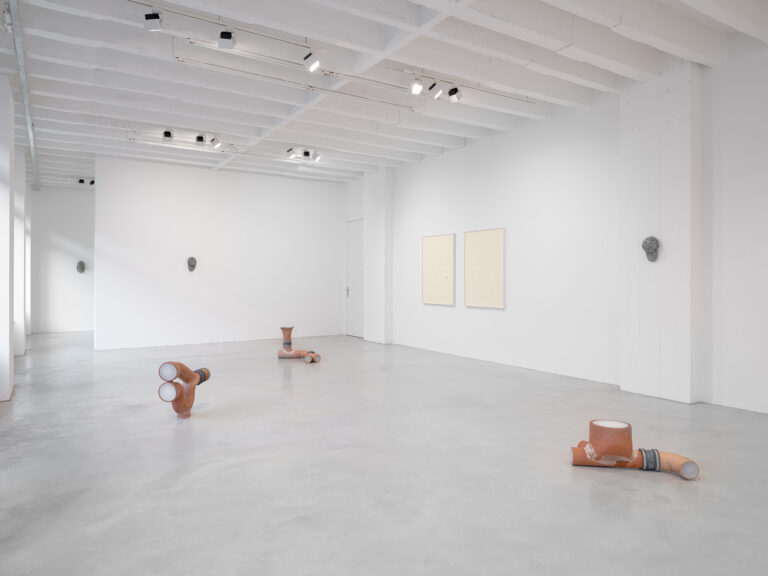 The artist frequently sources her materials from the street: raw objects shaped by weather, use and decay, their surfaces bearing the traces of time. This is also evident in a series in which Hultén works with clay drainage pipes she first encountered while rebuilding her fire-damaged home. The artist — whose mother worked as a genetic researcher and who therefore grew up with a refrigerator full of sperm samples — combines these materials with histological wax, a substance used to stabilise organic tissue, as well as human sperm from anonymous donors. The resulting whitish substance resembles a congealed fluid lodged within the pipes, lending the inert structures a strangely animate quality, and subtly undermining their association with technical progress.