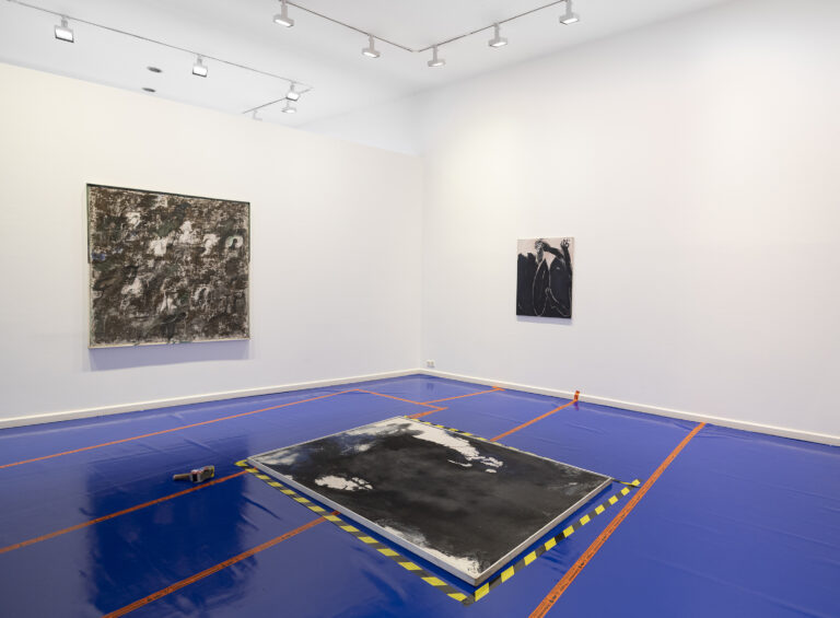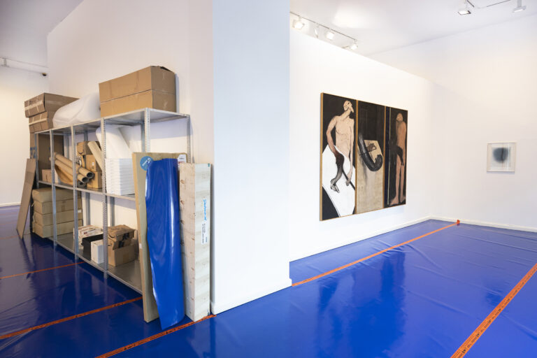 After an intensive working process lasting several weeks in the gallery space and in public, the newly created works by Sander and Schaal are integrated into the fluid exhibition concept. While the provisionally laid blue PVC tarpaulin initially served as pragmatic protection for the gallery floor, Sander and Schaal now use it as part of their series of works “Staring, into Everything”. This series focuses above all on the subject of looking at something, of immersing oneself in something.