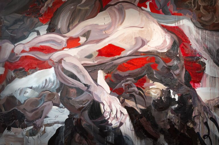 Multiple encounters unfold across the central canvas. One scene depicts sexual union, reframed by Mynerva as a myth—“a desperate attempt to become one.” Another vignette showing a body dwelling within a larger, translucent form evokes the philosophical idea of love as inscription, a shaping and imprinting of an individual’s identity. A figure infatuated with its own reflection alludes to the canonical allegory of Narcissus, while two bodies, facing each other, engage in a spoken exchange of affection and love. With its allusion to the compositional logic of the Old Masters, the painting’s poly-narrative cosmos offers an alternative interpretation of love as a collective, cathartic event that carries anguish, despair, and illusion. By applying deeply evocative visceral and emotional motifs, Mynerva fractures Western narratives about love not as a means of depicting how the traditional dramatic register of romance shapes our social lives, but rather to expose an inherent absence—emphasizing how the rhetorics of love function as a structure of lack.