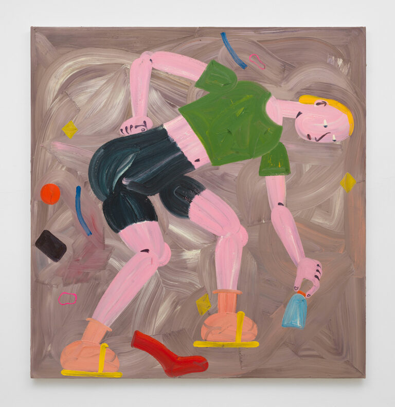 In Weaver’s paintings, everything is slightly larger-than-life and ill-fitting. The figures appear superficial and comically flat, their limbs line up clumsily as they form what Amy Sillman has called “this laughable casement that is the body.” These body casements are cased in another case, that is, the painting’s frame. As the bodies bend over to pick up the laundry from the floor, it seems as if they’re squeezing into the shallow pictorial space to fit the tight edges of the canvas. The domestic space becomes a Beckettian closed space fiction, inhabited by characters ready to perform the everyday claustrophobic tragicomedy of a body feeling out of joint.