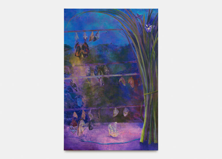 The nocturnal quality established through Noh’s theatrical vocabulary extends to moments of transformation. Puparium presents transformation as suspension, butterfly wings fluttering between states, front and back. Rather than staging a didactic metamorphosis, the painting captures the chrysalis as an enclosed space of vulnerability and latent vitality, the precise moment when change is happening but not yet visible. This sense of suspended transformation extends to Two girls and two butterflies, a double portrait of Kobayashi and her fourteen-year-old niece with butterflies resting on their shoulders.