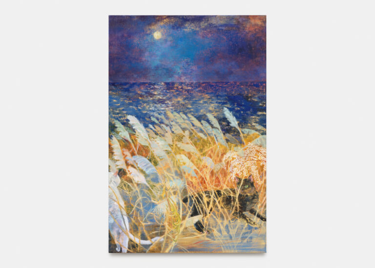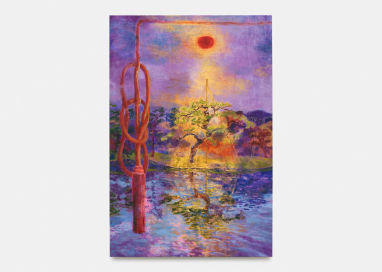 The exhibition unfolds with the measured temporality of Noh theatre, where a single gesture can extend across minutes and symbolic resonance takes precedence over literal narrative. Kobayashi draws on this theatrical tradition not as subject matter but as compositional logic, creating paintings that operate through mood, attunement, and a nocturnal palette. The pine tree makes this theatrical framework explicit. It references the iconic stage setting of Noh theatre, where a stylised pine tree anchors the backdrop. The tree depicted in her painting is based on one from a park in Shizuoka, her hometown, where it is wrapped in yukizuri ropes to protect its limbs from heavy snowfall, a traditional practice maintained by local gardeners. Such gestures of care, rooted in specific horticultural traditions, function in the painting as quiet reminders of the interaction between natural cycles and human attention. An Oriental turtle dove rests in the branches, its presence marking the passage of a still morning.