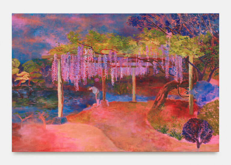 Kobayashi often paints from and around her family’s surroundings in Shizuoka, but these works are not landscape paintings in any traditional sense. They are layered compositions in which time folds and stretches, where personal memory blurs into theatrical convention, where contemporary countryside hosts figures from centuries-old plays. In Narcissus under the wisteria, Kobayashi draws from Caravaggio’s Narcissus but reimagines the scene beneath a Fuji wisteria tree in a park near her mother’s home. The wisteria, celebrated in classical Japanese texts like The Pillow Book and The Tale of Genji, symbolises longevity and enduring affection and shares its name with Genji’s first love in Murasaki Shikibu’s tale. The figure of Narcissus, in this context, becomes less a cautionary tale than a quiet reflection on longing, solitude, and the impossibility of reciprocated love.