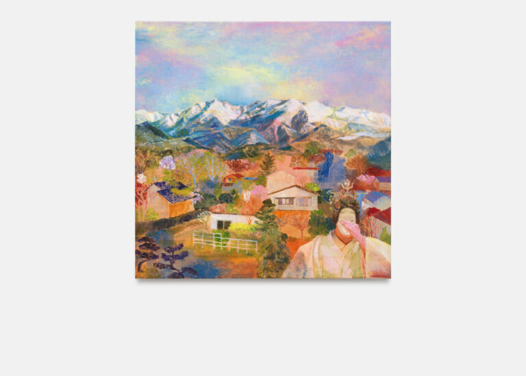 This convergence of theatrical space and remembered landscape recurs in A robe of a celestial maiden, which draws directly from the Noh play Hagoromo. In the play, a celestial maiden loses the feather robe she needs to return to heaven. Kobayashi transposes this figure into a contemporary landscape, where houses nestle among blossoming trees and snow-capped mountains. By setting the maiden’s longing for an unreachable heaven within her own hometown, Kobayashi creates a double nostalgia where theatrical allegory and personal memory converge in a space that functions as both stage and recollection.