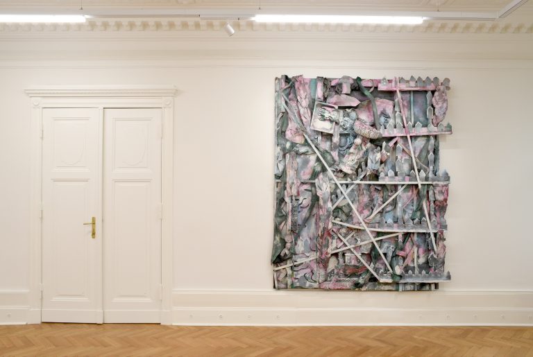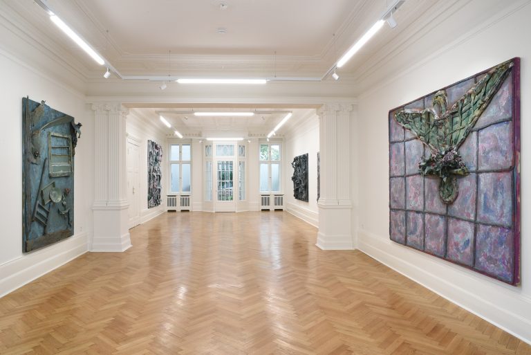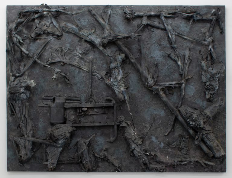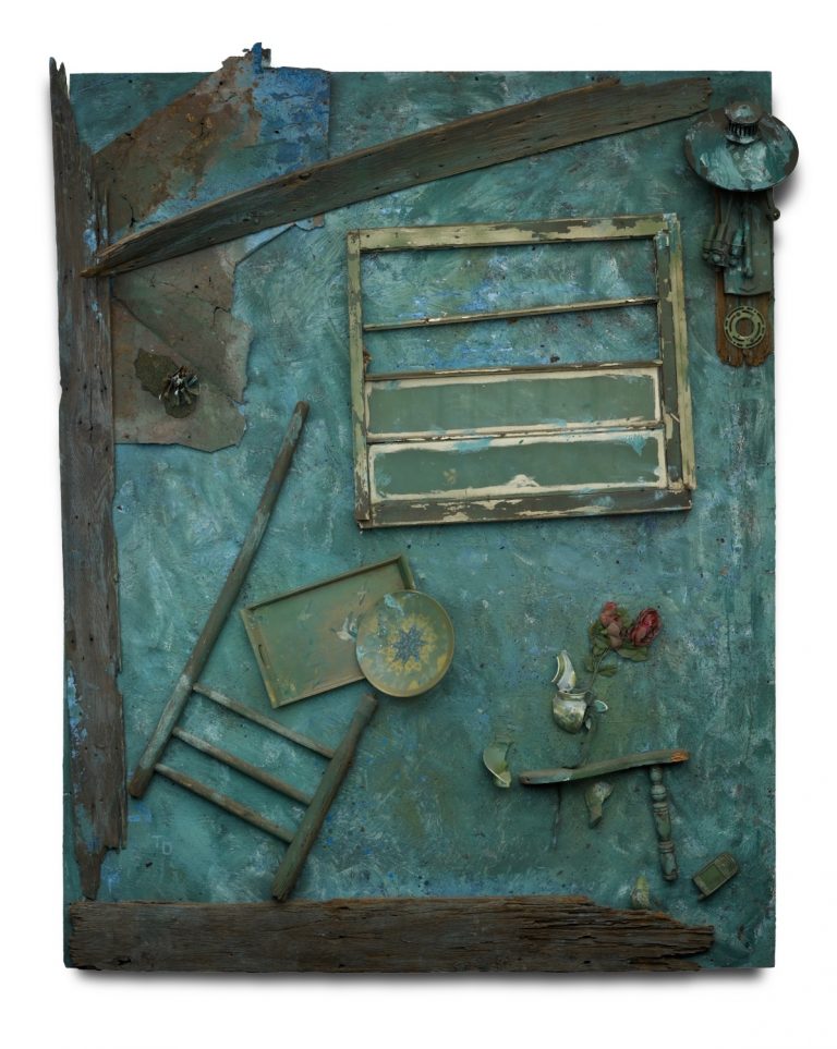 Neckties, rope carpet, artificial flowers, soil, tin, oil, enamel,