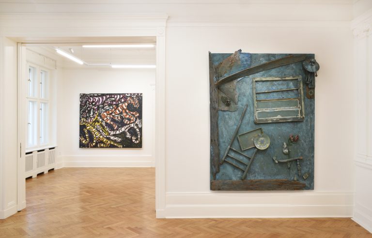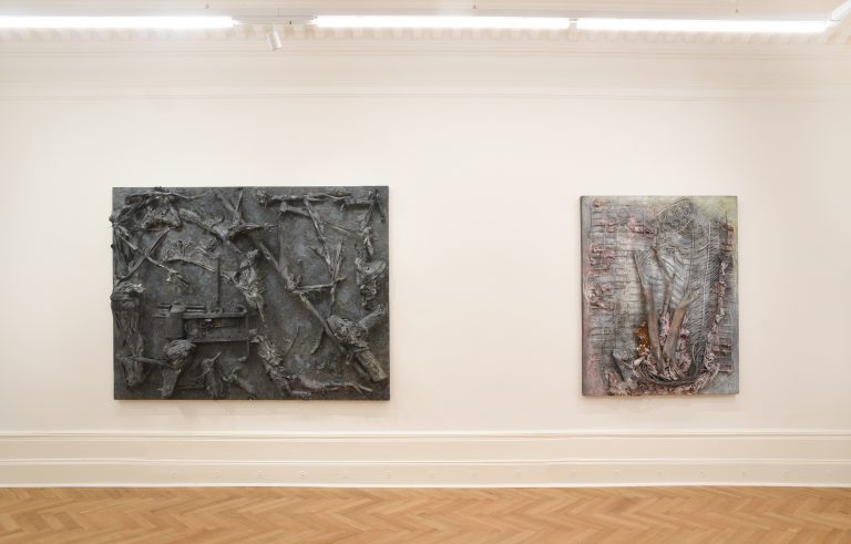 Plastic bottles, machine parts, roots, found metal, clothing,
