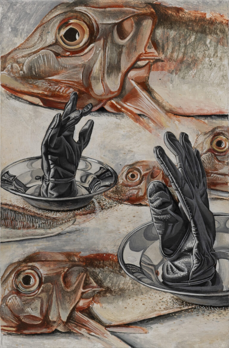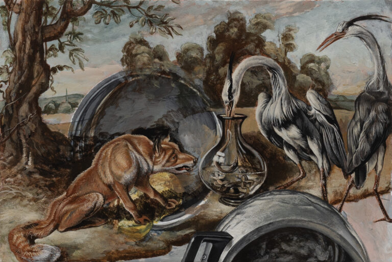 Some narratives span multiple canvases and others stretch beyond painterly fictions. The reoccurring leather gloves reinforce the fact that Marwitz’s staged puppets have no hands. Likewise, in the fable of the fox and the heron, each protagonist has what the other lacks. The ironically titled painting Photo of Artificial Cave declares its artifice both textually and visually, revealing itself as completely imagined. It’s no coincidence its dimensions are the same as a standard photo print or postcard.