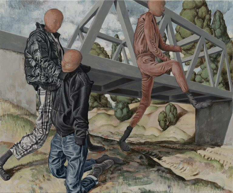 Despite these references, Marwitz paints mostly from life. The figures that populate his chaotic and collaged tableaux are life size puppets, staged in the studio and painted under the changing conditions of natural light and the passage of time. Snippets of buildings and landscapes seen from his studio windows are integrated into the paintings. This is also not to say that Marwitz is an observational painter. Instead, his works stage images in succession, stacking them and weaving them into one narrative that echoes the ahistorical simultaneity of our present.