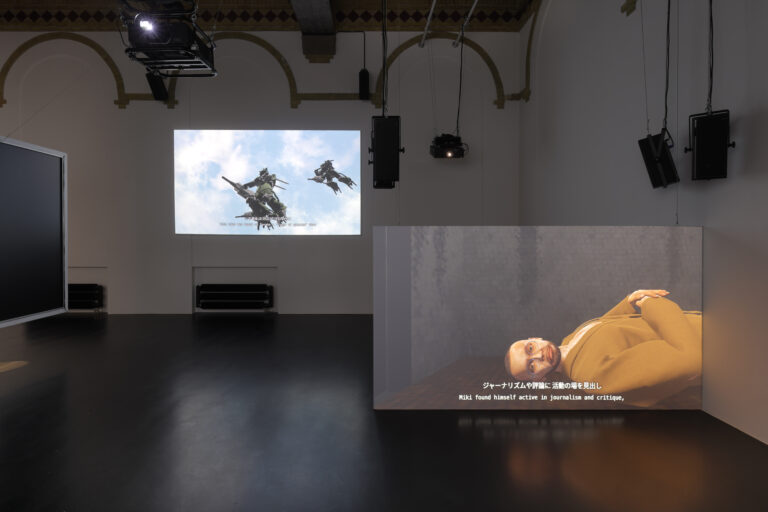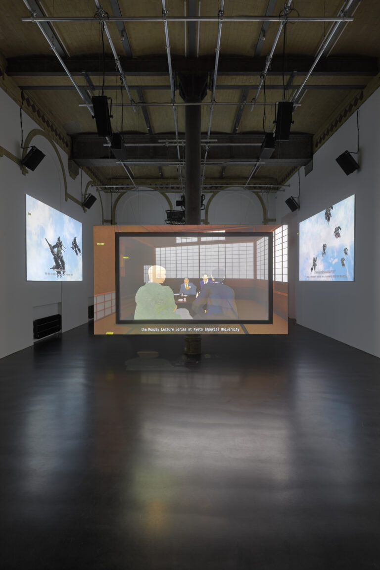Voice of Void (2021), Ho’s virtual reality-assisted video projection, transforms two of the exhibition’s spaces into sites of the secretive November 1941 roundtable “The World-Historical Standpoint and Japan,” still controversial to this day for its philosophical reckoning with military action. Conducted by philosophers Keiji Nishitani, Masaaki Kosaka, Iwao Koyama and Shigetaka Suzuki, the conversation attempted to devise a theory of world history against the backdrop of Japan’s involvement in the Second World War. The concepts expressed here grew from the Kyoto School of the early 20th century – a movement that sought to supplant prevailing Eurocentric modes of thought with a philosophy born and cultivated in Asia. The discussions of the past and visions for the future of the symposium at the origin of Ho’s work were often splintered and dissonant, and raised more questions than they answered as the global community spiraled into war. The theories and lives of Ho’s protagonists play out in layered projections showing computergenerated models of science-fiction mecha robots in flight, a prison structure as seen from both inside and in disembodied wide angle, and the roundtable meeting itself. Voiceover provides whispered introductions to the School’s approaches, while virtual-reality headsets, placed at the ready on tatami mats, invite a viewer to enter the work, acting as a participant in various scenes beginning with a tea-room rendezvous, allowing them to shift between characters, scenarios, perspectives, stories and timelines.