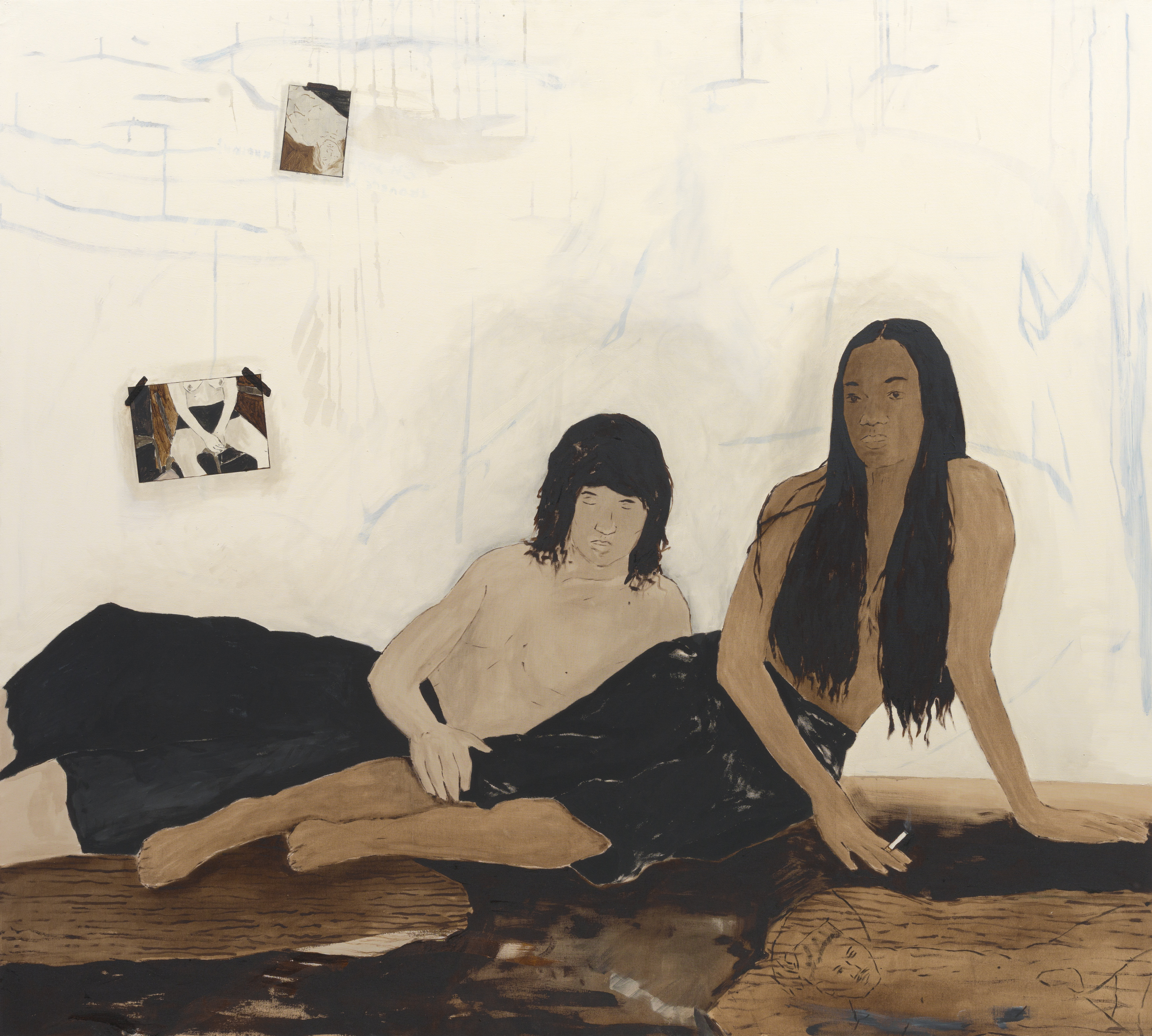 Brett Charles Seiler, MY BOYFRIEND AND HIS BEST FRIEND (WILLEM AND CHARITY), 2025. Bitumen and wall paint on canvas, 200 × 180 cm. Courtesy Galerie EIGEN + ART Leipzig/Berlin.